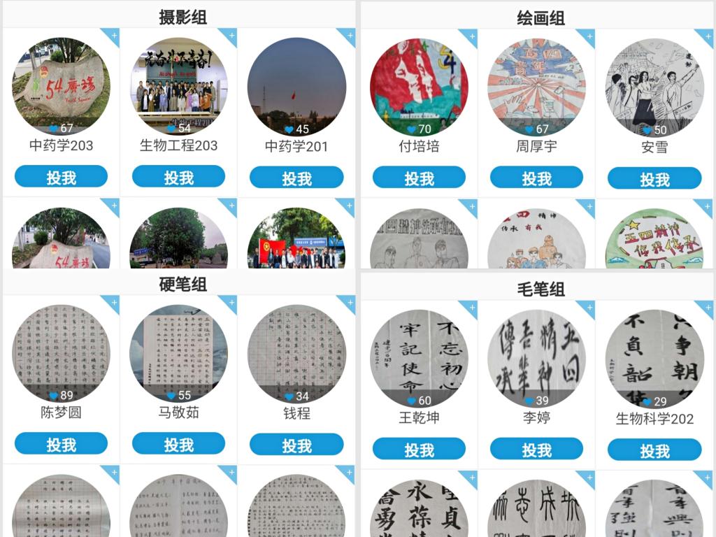 在前期充分的准备工作完成之后,学院召集各班班干征集作品,吸引了许多艺术爱好者的踊跃报名。本次活动采用易班线上投票的方式展开,分为摄影组、绘画组、硬笔组和软笔组四个部分,共收集34副书画摄影作品。这些作品主题鲜明,内涵丰富。摄影多为校园景色,突出新时代青年昂扬的精神面貌,光影交织、色彩鲜明。书法或工整隽秀、或挥洒自如、或浑然古朴,字里行间浓浓爱国热情;绘画笔墨淋漓、激扬山河,祖国大好河山跃然纸上。作品集思想性、艺术性、观赏性于一体,导向正确,各具特色,具有较高的品味,不乏精品力作。经过最终统分,生物工程203班斩获摄影组第一名,来自中药学201班的付培培荣获绘画组第一名,中药学203班的陈梦圆荣获书法硬笔组第一名,生物工程203班的王乾坤荣获软笔组第一名,其他参赛选手分获二、三名。