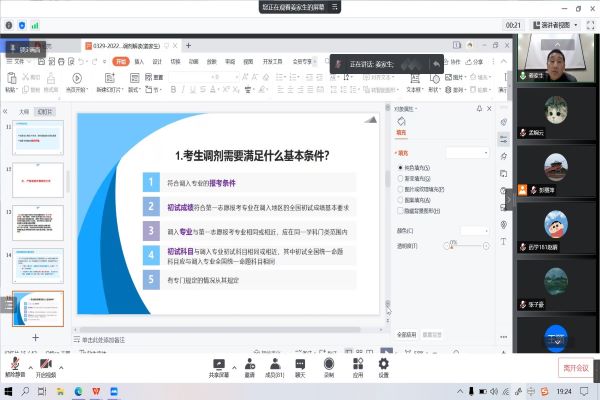 姜家生以国家的招生调剂政策为依据,针对研究生招生政策、研究生线上复试方式、调剂学校与专业选择等内容进行了全面细致的解读,并对初始统考科目涵盖问题、调剂需要满足的条件、专业调剂限定等常见问题以及调剂系统的开放与关闭做了详细解读。他提醒同学们要未雨绸缪,利用一切可利用的渠道和资源,做实前期的调研与信息搜集工作,把握好细节,凸显特长优势。随后,各位考生就自己在复试及调剂上的问题如专业兴趣、复试题目、调剂系统开放时间等进行了互动交流。