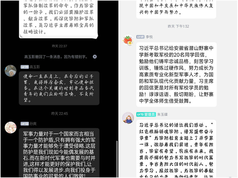 活动期间,各团学组织带领同学认真学习习近平总书记给安徽省潜山野寨中学新考取军校的20名同学回信原文及相关文章,发表学习感悟。