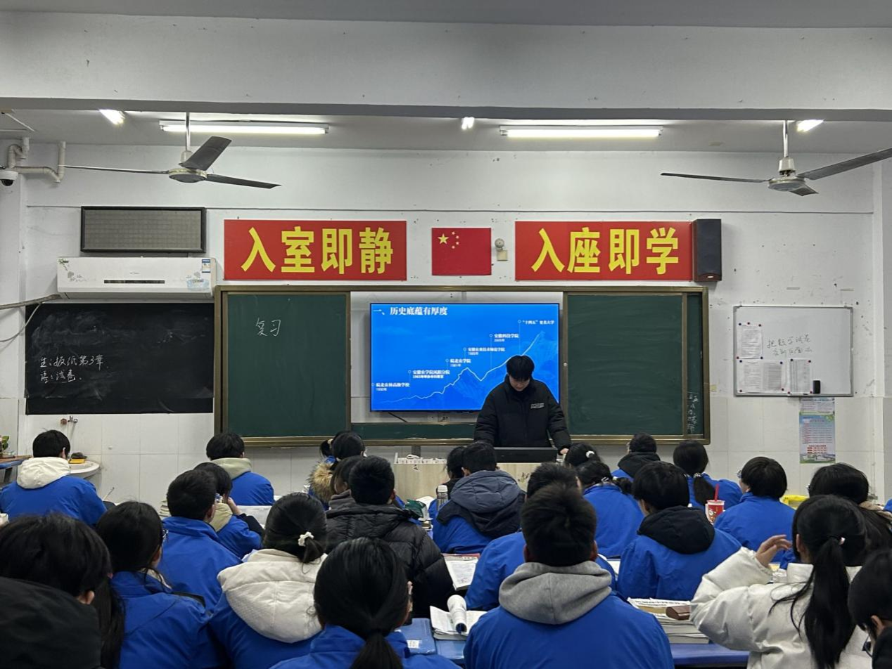 为了更好地加强我校与优质生源地的沟通交流,增强师生对我校的了解和认识,提高我校的知名度和社会认可度,1月26日下午,以生命与健康科学学院药物制剂233班汪明宇为队长,信网学院计算机科学与技术232班吴宗阳为队员的实践小队赴泾县中学开展“我回母校报喜讯”寒假实践活动。