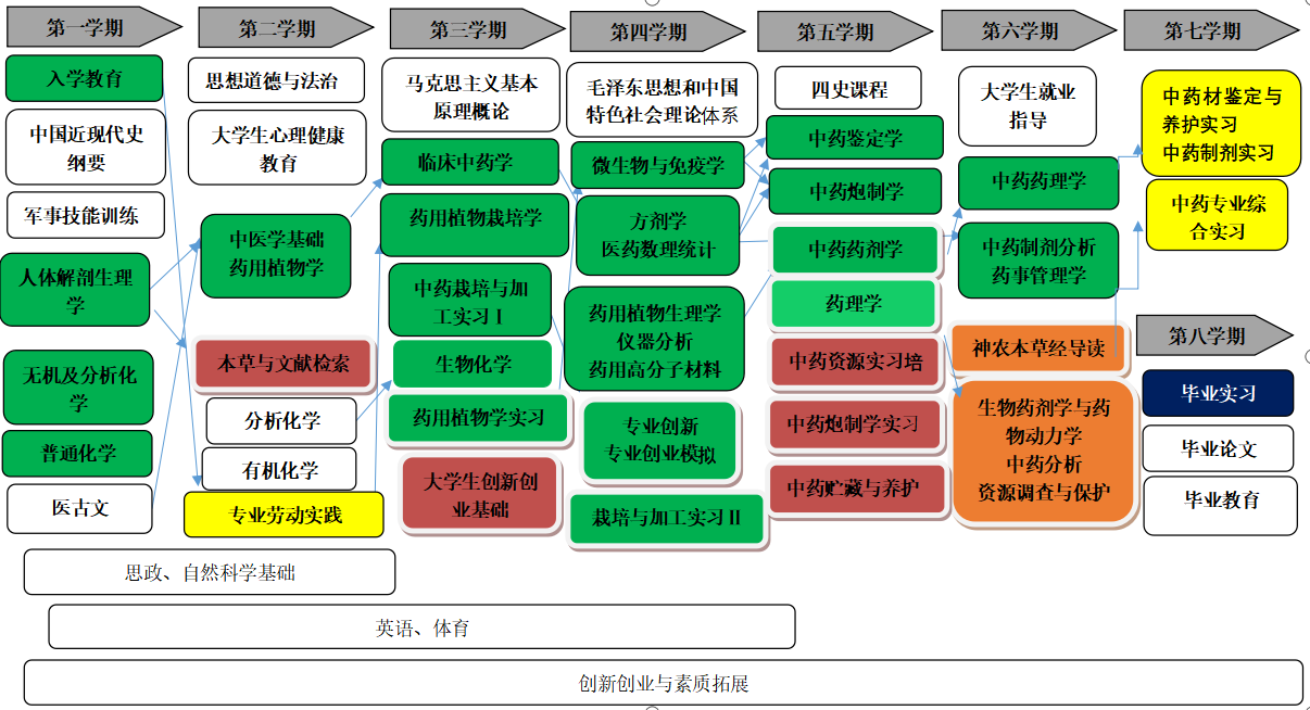 个性化拓展课程:医古文、本草与文献检索、中药拉丁语、专业英语、药厂GMP、中药制药辅料应用学、中药材贮藏与养护、动物药材学、生物技术制药、神农本草经导读、新药研究与申报、医药市场营销学、药用菌栽培技术