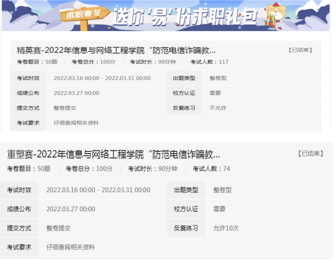 为预防电信网络诈骗,增强学生安全教育意识,3月2日至今,信息与网络工程学院充分利用线上线下相结的方式,对学院近1500名学生展开防范电信诈骗教育知识线上竞赛活动,深入普及防范电信诈骗安全知识,加强法治教育。