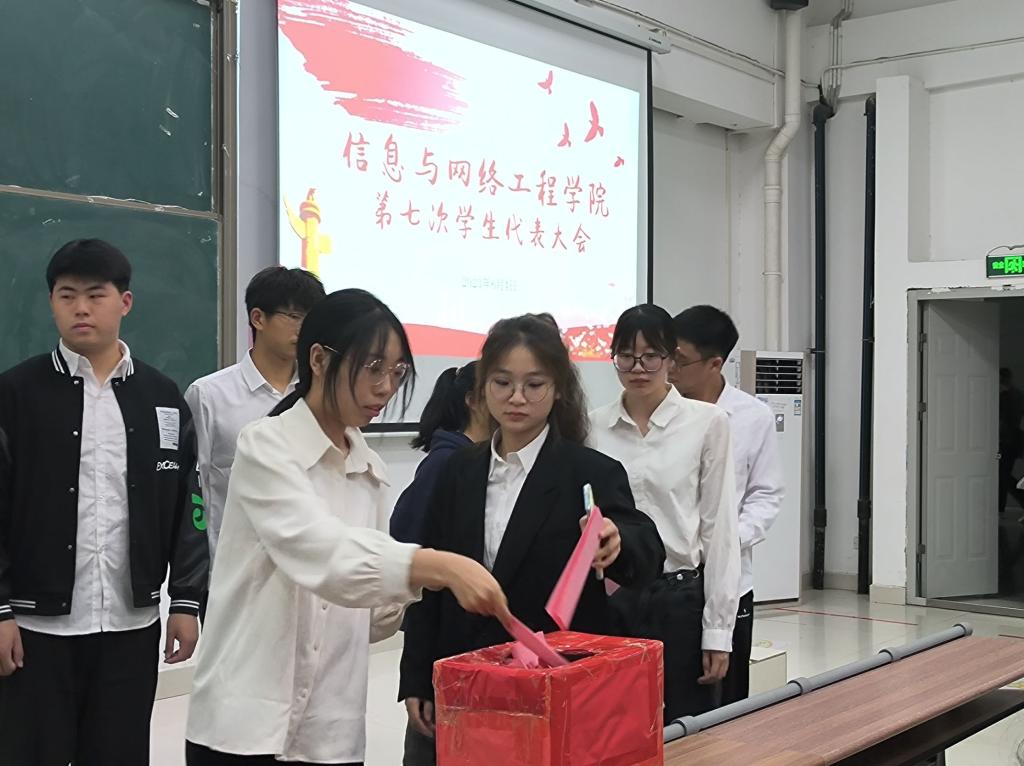 大会听取审议并通过了信息与网络工程学院学生会工作报告,表决通过了《选举办法》和监票人、计票人名单,宣读了校团委校学生会的文件批复,介绍了候选人基本情况,选举产生3名第七届学生会主席团成员和35名新一届学生委员会委员。