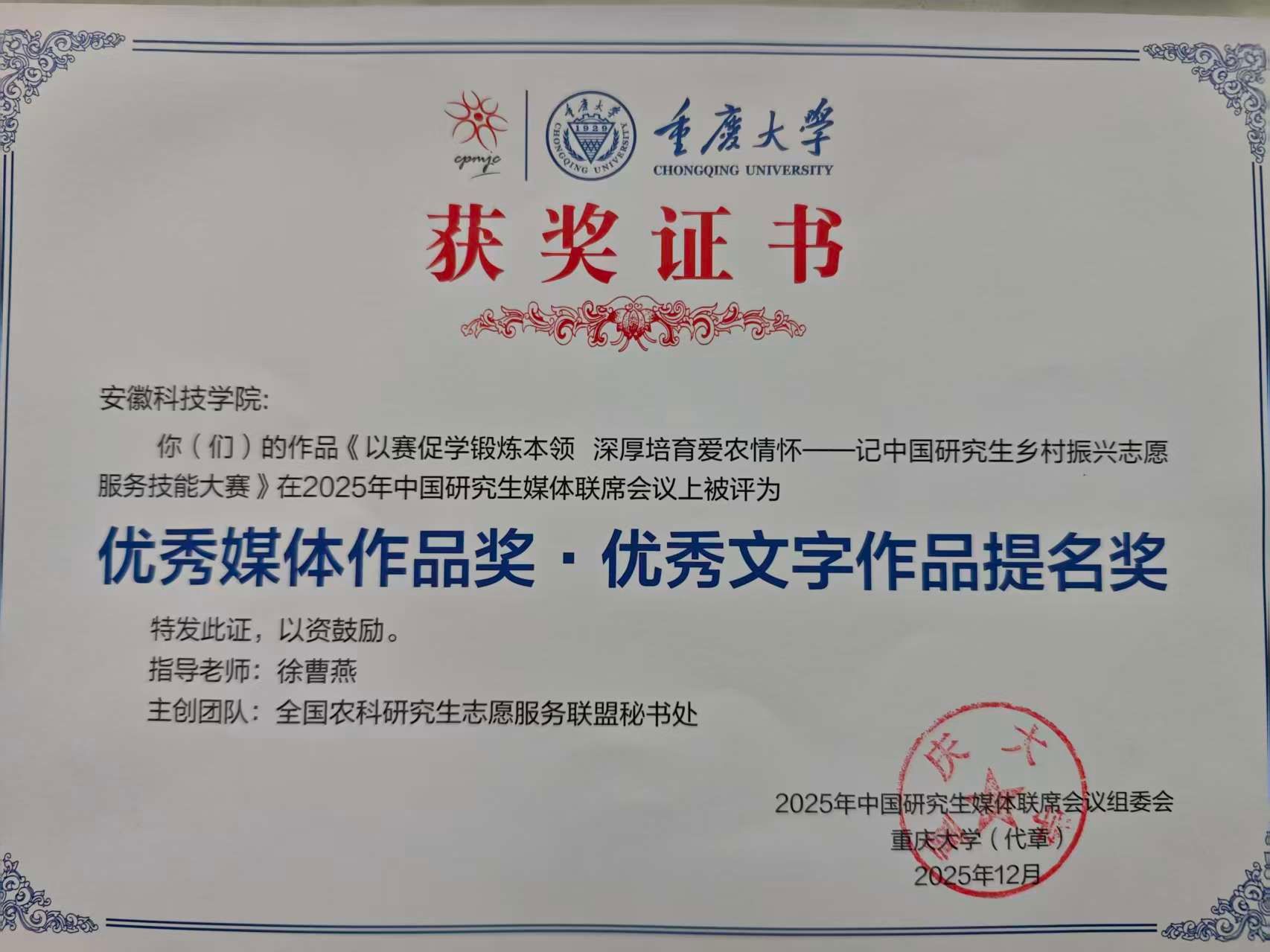 作为全国农科研究生志愿服务领域的重要组织,全国农科研究生志愿服务联盟首次组织代表参会。由联盟秘书处精心撰写的作品《以赛促学锻炼本领 深厚培育爱农情怀——记中国研究生乡村振兴志愿服务技能大赛》,经多轮评审,最终斩获 “优秀文字作品提名奖”,这既实现联盟在全国研究生媒体领域的奖项突破,更彰显BB手机官方网站_BB(中国)作为联盟常任主席单位及秘书处挂靠单位创设并运营联盟公众号、支撑联盟秘书处工作的扎实成效。