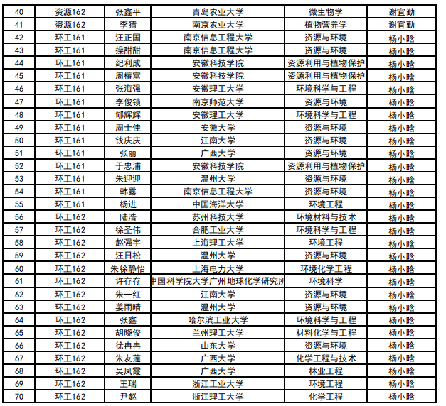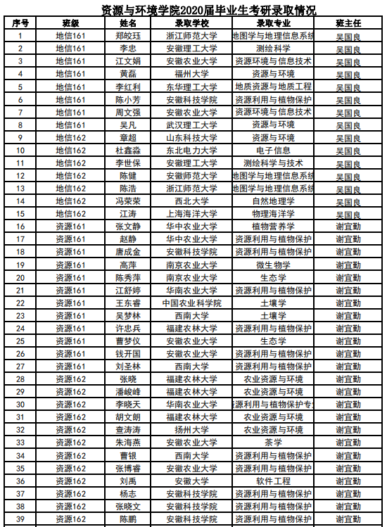 2020年硕士研究生招录结果陆续公布,资源与环境学院2020届毕业生共218人,报考研究生126人,报考率57.8%,达线86人,达线率39.4%,截止到目前,我院2020届毕业生已有70人被录取为硕士研究生,总体录取率为32.1%。其中,地理信息科学专业录取15人,录取率为21.1%;农业资源与环境专业录取26人,录取率为40.6%;环境工程专业录取29人,录取率为34.9%。985、211、科研院所录取24人,占录取总人数的34.2%。地理信息科学专业学生吴凡被武汉理工大学录取,环境工程专业学生徐冉冉、张鑫分别被山东大学、哈尔滨工业大学录取,杨进被中国海洋大学录取,农业资源与环境专业学生张文静、赵静被华中农业大学录取。近年来,在学院党政的正确领导下,学院高度重视学生考研升学工作,把学生考研作为学院提升教学质量、加强学风建设的重要抓手,在建立完备的动员机制和激励机制的同时,不断强化对考研学子的相关服务工作,营造了一个良好的考研升学环境。(特约通讯员:吴国良 审核:李孟良)