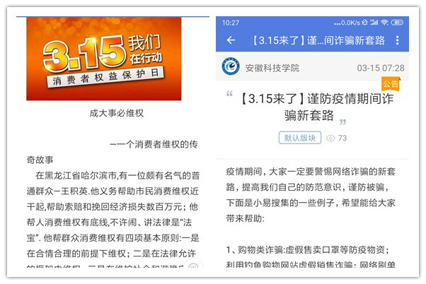 为提升同学们安全防范意识,引导其依法维护自身合法权益,3月15日,财经学院通过易班平台开展“3·15”消费者权益保护暨安全教育主题活动。