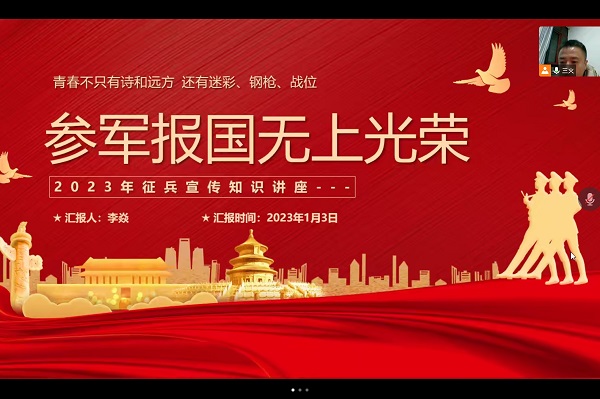 为全面做好2023年春季大学生征兵宣传动员工作,鼓励毕业生积极应征入伍,1月3日,动物科学学院线上召开2023届毕业生征兵宣传动员会。会议由学院征兵联系人李焱主讲,2023届毕业班各班班委参加会议。
