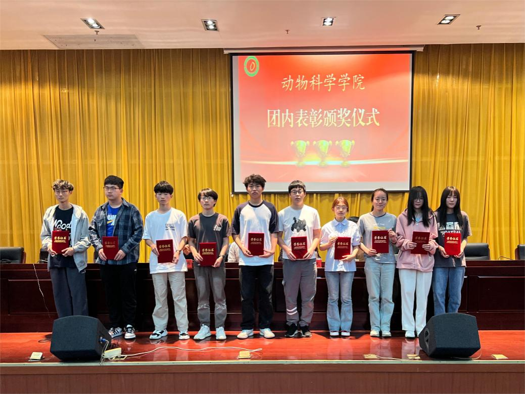 开幕式上,与会领导和嘉宾为动物科学学院十佳大学生、团内表彰获奖团体、学生颁奖。