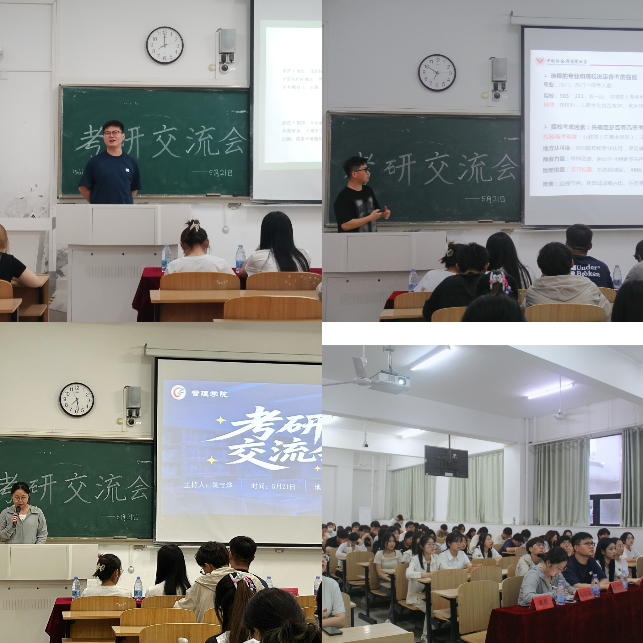 为帮助学生了解考研流程,掌握备考技巧,管理学院于5月21日晚上在致知楼A108举办“考研交流会”。本次活动吸引了众多有考研意向的学生参与,现场座无虚席,气氛热烈。