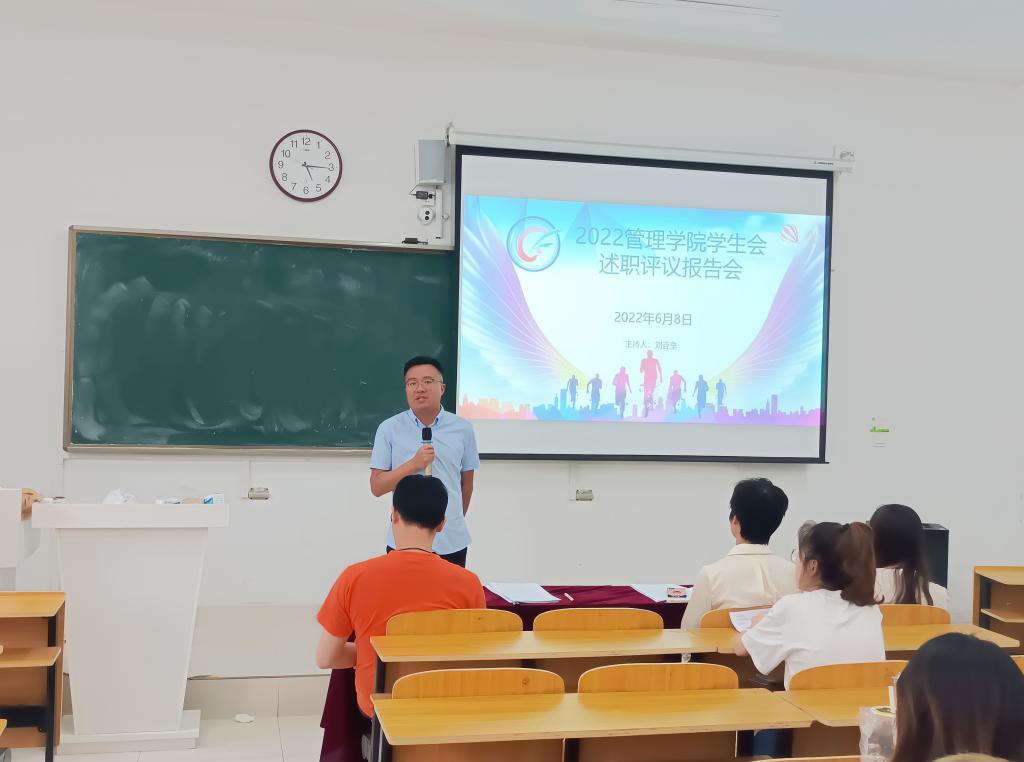 近日,管理学院团委组织开展院学生会2021-2022学年述职评议报告会,学院党委副书记陶漫、团委副书记江旭聪、学生会指导老师姚姝媛、社团管理部指导老师黄斐出席会议。校学生会主席团成员戴家珍应邀到会指导。