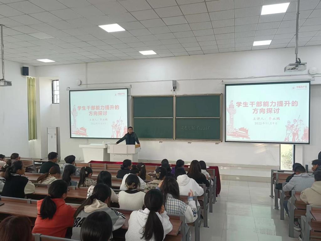 为进一步提升学生干部队伍综合能力和素质,近日,管理学院2022下半年学生骨干培训班第一讲在龙湖校区开讲,学院党政办主任李永鹏面向全体培训班学员作了“学生干部能提升的方向探讨”的专题讲座,讲座由团委副书记江旭聪主持。
