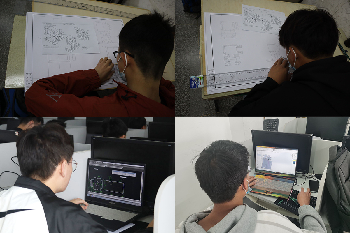 三项赛事活动主题鲜明、内容丰富、形式多样——在CAD、三维比赛中,参赛同学准备充分,按照命题要求规范操作,熟练敏捷地完成了电脑绘图,展现出扎实的专业基础和良好的绘图技能。在手工绘图比赛中,参赛同学全身心投入绘图,一丝不苟、娴熟的运用各种绘图工具,画定位线、布置图形位置、画底图、标注尺寸等一气呵成,在规定的时间内将各自专业绘图的实践能力标准完整的展现于图纸上。