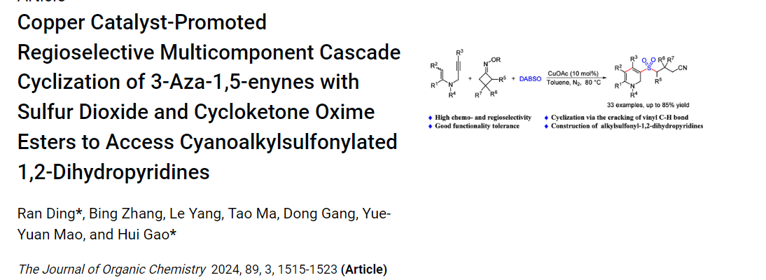 李子荣教授团队在烯胺杂环合成上再次取得重要进展,相关成果以"Copper Catalyst-Promoted Regioselective Multicomponent CascadeCyclization of 3‑Aza-1,5-enynes with Sulfur Dioxide andCycloketone Oxime Esters to Access Cyanoalkylsulfonylated 1,2-Dihydropyridines”(图1)和“Sulfonyl radical-induced regioselective cyclization of enamide−olefin to form sulfonylated 6-7-membered cyclic enamines”(图2)为题发表在《The Journal of Organic Chemistry》期刊上。