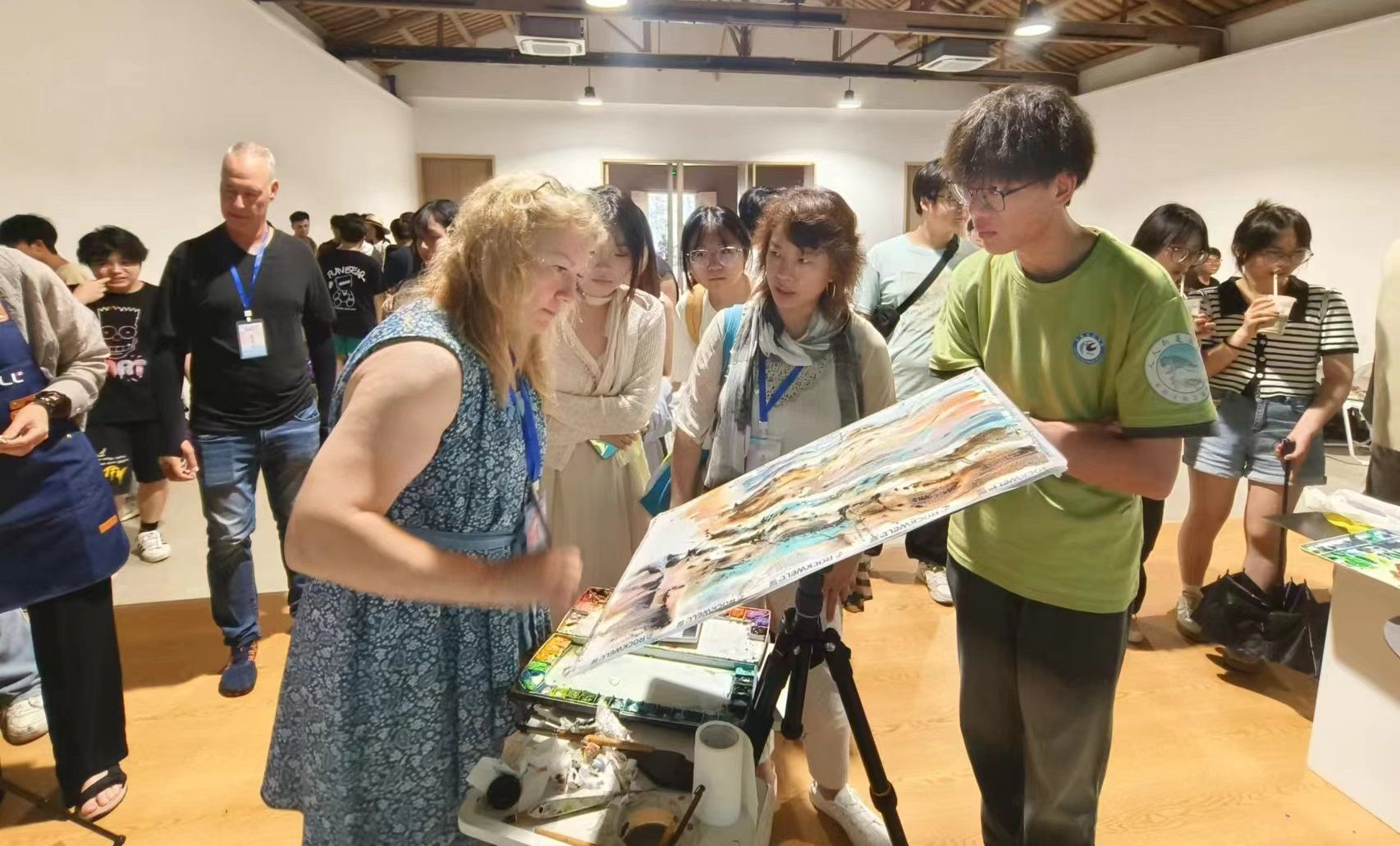活动中,带队老师郑艺鸿教授与俄罗斯艺术家Anastasia Petryaeva就作品的细节处理进行了深入的交流,从线条的流畅度、光影的处理以及色彩的搭配等方面入手,探讨了如何更好地捕捉自然之美,并将其转化为具有艺术感染力的作品。李若愚老师用流利的外语与多位艺术家进行对话交流,并进行了翻译指导工作。这种跨文化的艺术对话,不仅增进了师生们对国际艺术动态的了解,也激发了他们对艺术创新的热情和探索欲望。