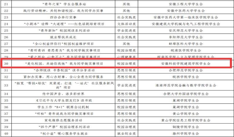 为深入学习贯彻习近平总书记关于青年工作的重要思想,践行学联学生会组织全心全意服务同学宗旨,发现、巩固、推广一批做得实、叫得响的服务项目, 推动学生会组织改革向纵深发展, 经初评、复核、省学联十大代表投票等环节,建筑学院学生会“美化校园,共助你我他”获2023年度安徽省高校学生会组织“我为同学做实事”(校园治理类)项目。