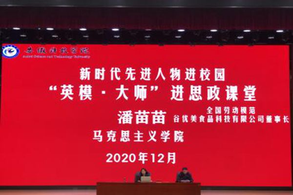 全国劳动模范、安徽省优秀共产党员、安徽省三八红旗手、安徽青年五四奖章获得者、安徽谷优美食品科技有限公司董事长潘苗苗走进思政课堂,以“开阔创业之路,照亮精彩人生”为题应邀为龙湖校区2019级300多名大学生做了作主题报告。马克思主义学院班子成员、部分思政课教师聆听报告会。马克思主义学院院长张德化主持报告会。
