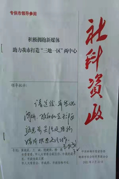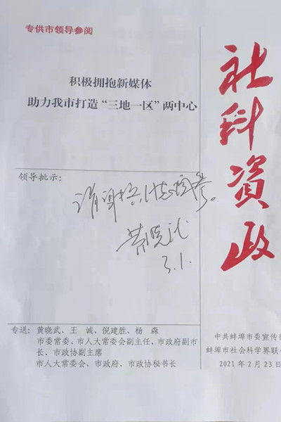 近日,由我校马克思主义学院教师吕计跃博士撰写的《积极拥抱新媒体 助力我市打造“三地一区”两中心》咨政报告,分别获蚌埠市委书记黄晓武、市长王诚明确批示。