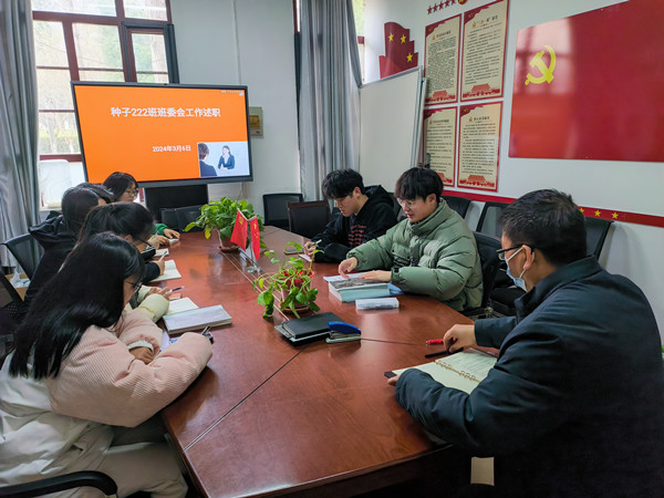 2024年3月6日上午,种子222班班委会在农学院120党员活动室召开述职会。辅导员张轶辉主持,全体班委参加述职。