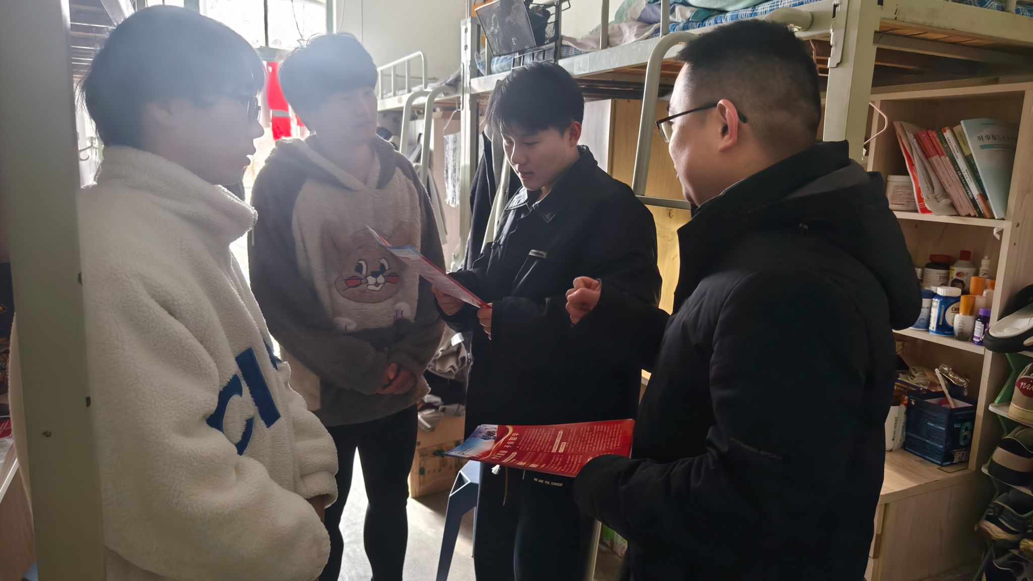 老师们携带着宣传单页,走进学生宿舍,结合退役复学的学生故事,向同学们讲述了军旅生活的精彩与意义,并一对一为报名的毕业生答疑解惑。通过向学生们细致讲解征兵的基本要求、报名步骤、学校政策以及毕业注意事项等多方面信息,使大家对征兵有了更全面和深入的认识。