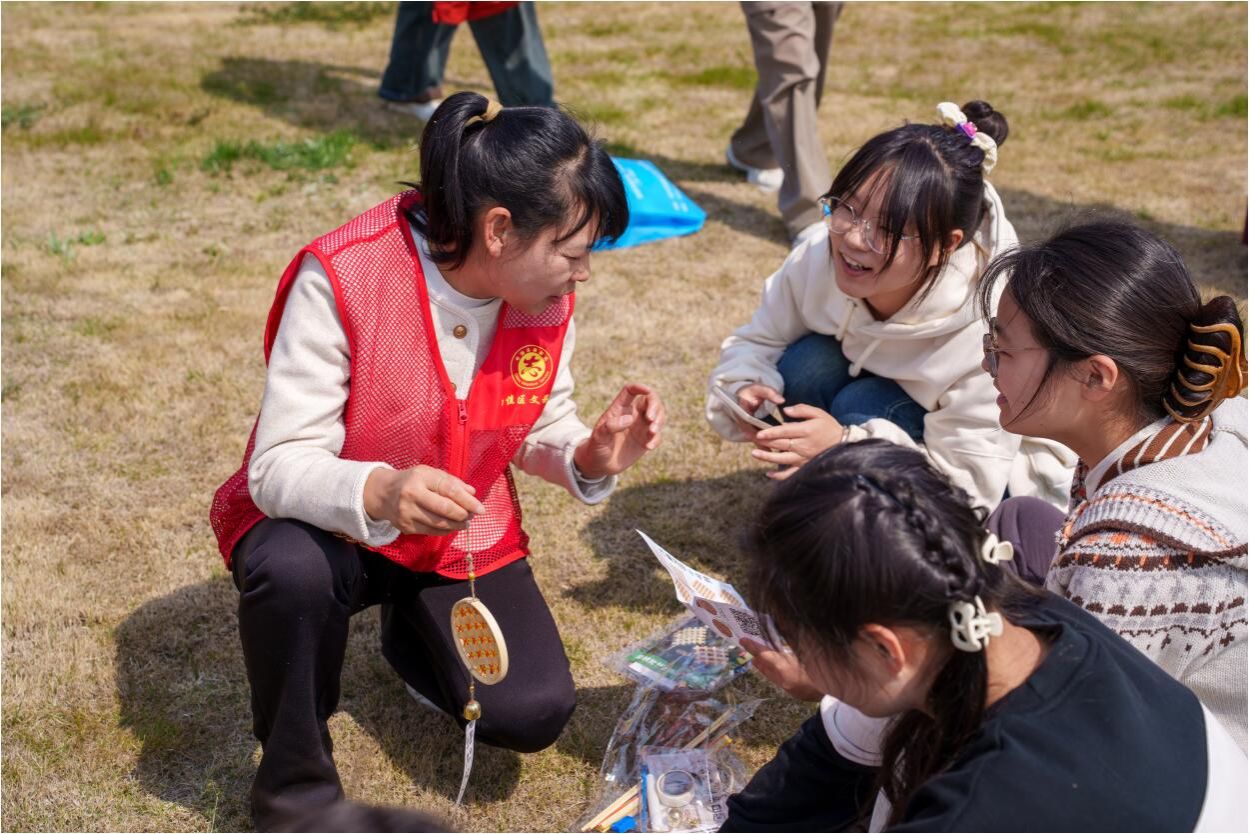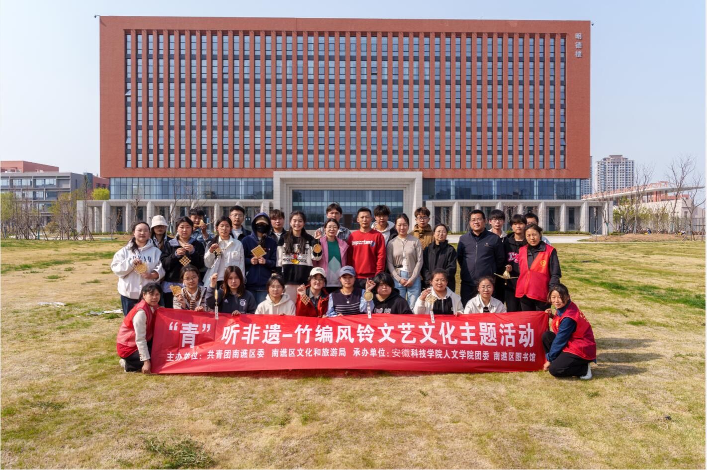 为弘扬中华优秀传统文化,赋予非遗鲜活生命力,4月2日下午,共青团滁州市南谯区委、南谯区文化和旅游局、图书馆和人文学院团委,在明德楼南侧草坪开展“‘青’听非遗——竹编风铃”非遗主题活动。南谯区四级主任科员孙毅倩、南谯区图书馆王梦露及相关志愿者参加,活动由学院团委副书记焦雪松主持。