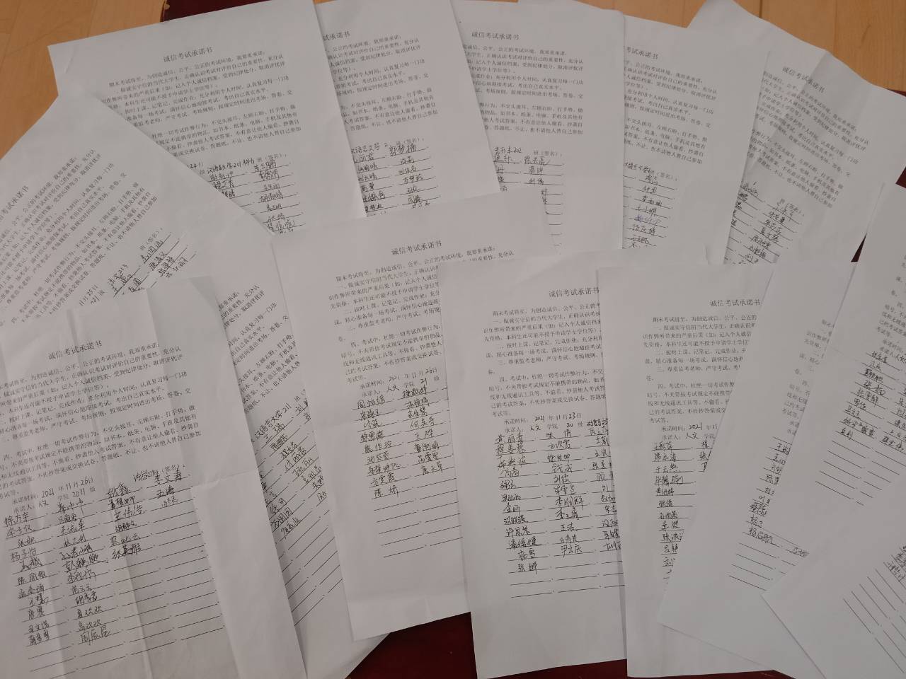 会上,辅导员向学生们强调了诚信考试的重要性,同时敦嘱学生要认真备考,严格遵守考场考纪。各班级班干部还组织了全班学生在诚信考试承诺书上签名,以便提醒学生们要诚信考试,杜绝一切作弊行为。接着,辅导员预祝学生们在接下来的考试中获得优异的成绩,班会在学生们热烈的掌声中结束。