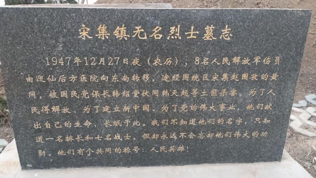 解放战争时期,刘邓大军千里跃进大别山途径安徽临泉,部队医院安排伤病员向东南转移。1947年腊月27日,8名解放军伤病员在途径国统区宋集镇赵围孜村黄冈时,被国民党反动派抓捕并杀害,当地群众将他们的尸体悄悄掩埋在宋集镇赵围孜村。解放战争胜利后,群众自发立碑纪念。