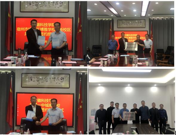 在签约授牌仪式上,魏龙飞代表宿州市埇桥区博雅学校、博睿学校、宿城一中城南学校,欢迎李晓东一行的到访交流,简要介绍了学校教育发展现状及未来规划;李晓东对三校在近年高考中取得的优异成绩表示祝贺,并简要介绍了BB手机官方网站_BB(中国)及人文学院的办学历史、学科专业设置、师资队伍、科学研究、社会服务等情况;李磊就宿州经开区的发展历程、未来布局做了详细介绍;张严政对《就业基地协议》、学生未来就业方向进行细致解读;张胜利、王勇、韩斌、许成虎分别就企业文化及未来发展进行了交流;苏兆龙结合普通高等学校师范类专业认证工作要求,对现阶段本科教育人才培养方案进行深入解读,并征求用人单位修订意见和建议。李晓东、张严政、苏兆龙,分别与学校、律师事务所、企业相关人员举行了就业基地签约暨授牌仪式。