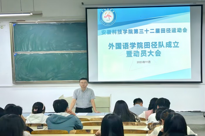 11月2日晚,外国语学院在求知楼A座102教室召开参加校第32届田径运动会田径队成立暨动员大会。外国语学院党委副书记张海亮,团委副书记宋兵兵,学院艺体中心干部及全体运动员参加会议,会议由专职辅导员张薇薇主持。